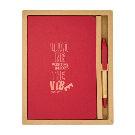 Zestaw składający się z notesu A5 w linie i długopisu. Notes w twardej oprawie z tasiemką do zaznaczania zapisanej ostatniej strony i elastyczną gumką chroniącą wnętrze. 80 kartek w kolorze kremowym (papier 70 g/m2). Bambusowy długopis, wyposażony w niebieski wkład. Zestaw pakowany jest w brązowe pudełko.