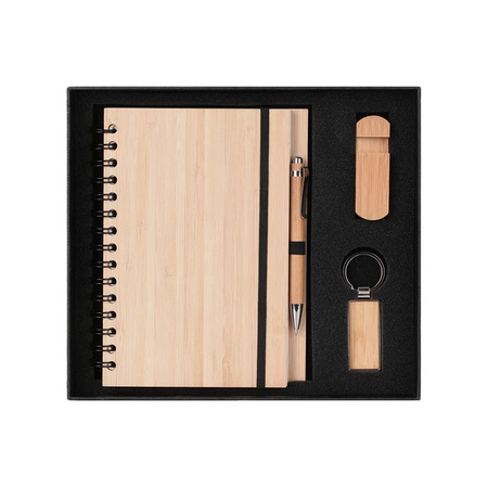 - Bambusowy zestaw w upominkowym pudełku. Składa się z notesu w formacie A5 (70 kartek w linie, 80g/m2 ), długopisu z czarnym wkładem, breloka oraz organizera na kable z funkcją podstawki pod telefon.