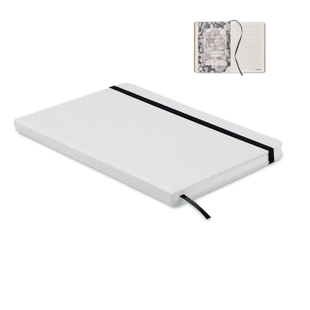 - Notatnik A5 z twardą okładką z recyklingowanego kartonu. 160 z papieru w linie (80 kartek). Dopasowana gumka zamykająca i tasiemka do oznaczania stron.